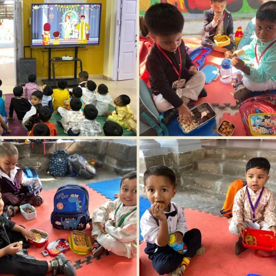 A Diwali party was organised for the students of the Nursery on 16th October, 2025. The children came to school dressed in their best traditional clothes and they carried traditional Diwali ‘faral’ in their tiffin. They were shown a special video on the ‘Festival of Lights’ and they also danced happily to various Diwali songs. The celebrations ended with everyone greeting each other “Happy Diwali” cheerfully.