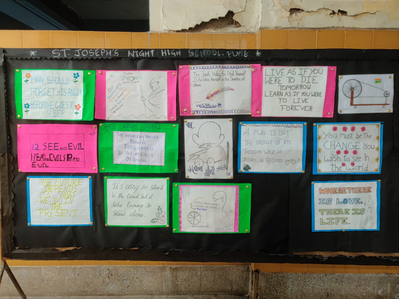 The Gandhi Jayanti celebration was held on 1st October at St. Joseph’s Night High School with great enthusiasm and respect. The programme began with students singing patriotic songs dedicated to Mahatma Gandhi. They also spoke about the importance of Gandhiji’s quotes and explained the message behind the three monkeys of Gandhiji, symbolizing the values of “See no evil, Hear no evil, and Speak no evil.”
