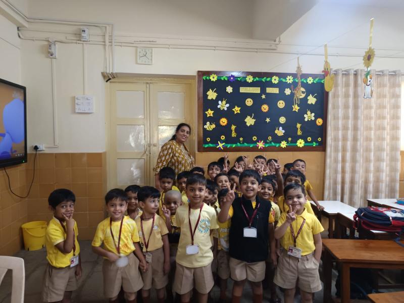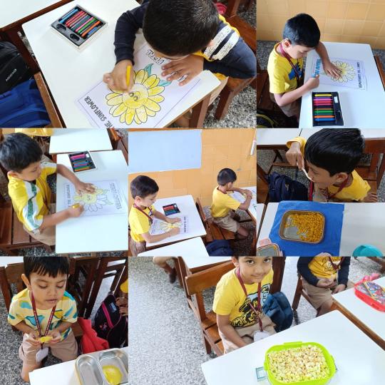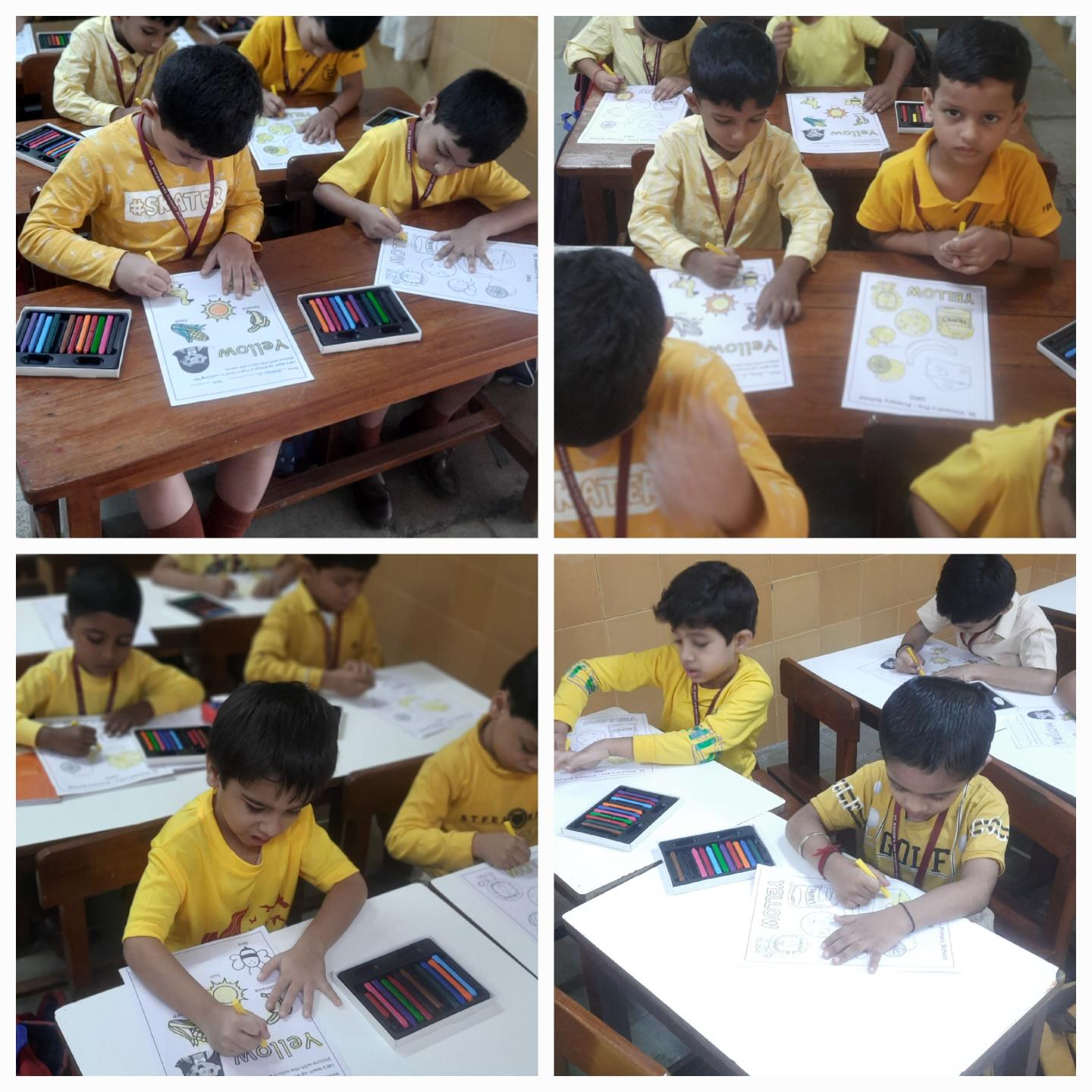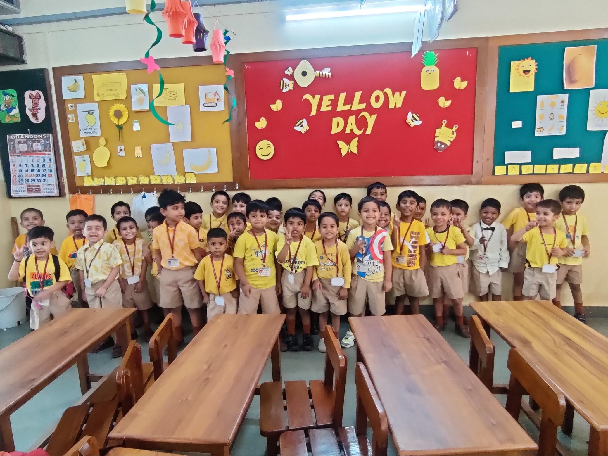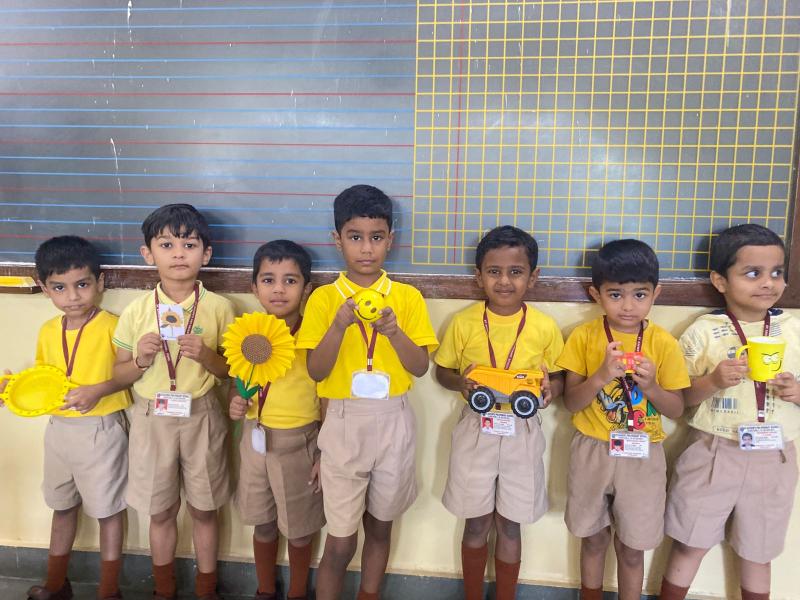 Both LKG and UKG boys wore Yellow shirt, bought yellow snacks for tiffin and explored yellow colour in their classrooms. Worksheets were given for colouring the yellow objects. Classrooms were decorated with yellow craft work hangings and board decorations.